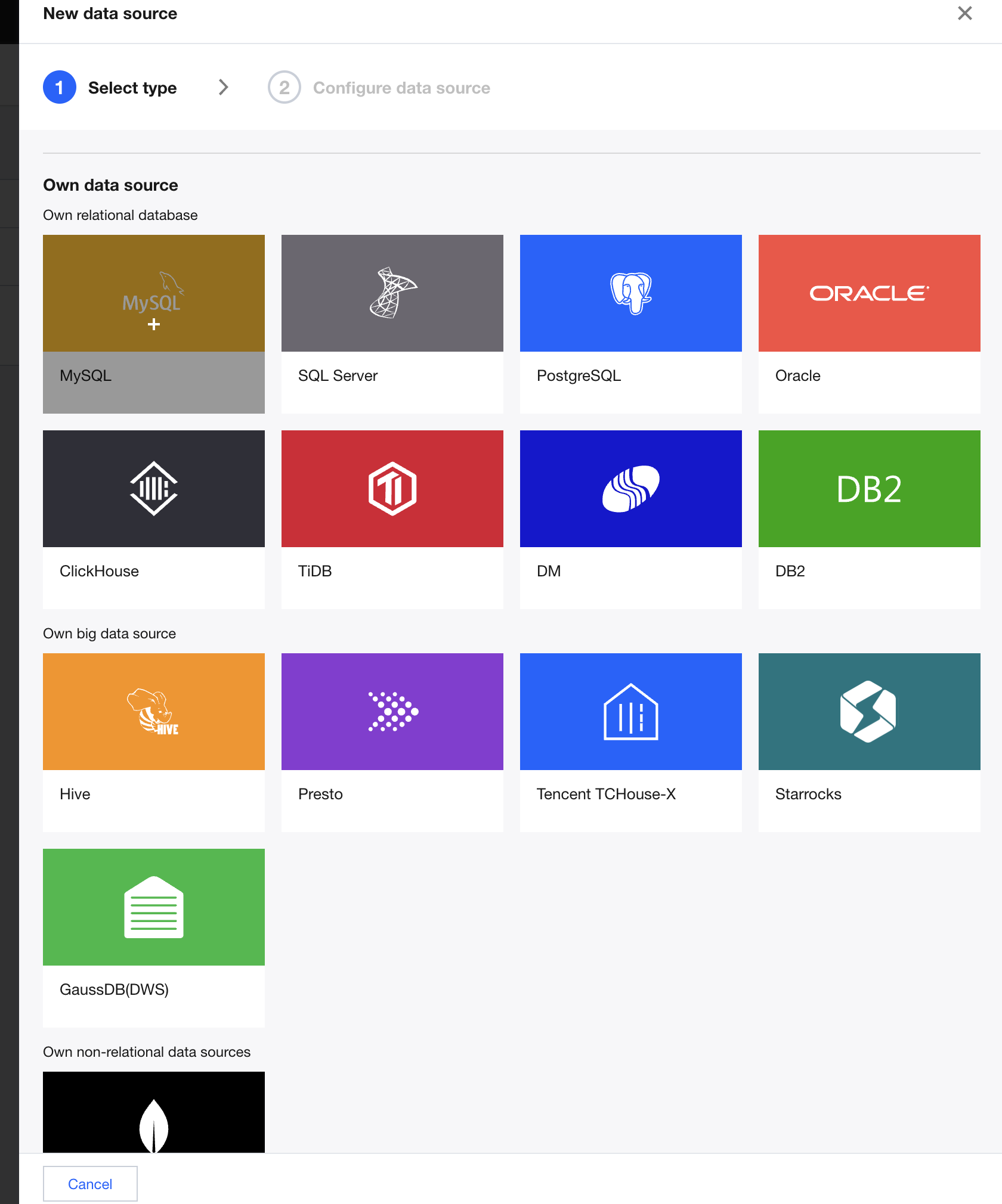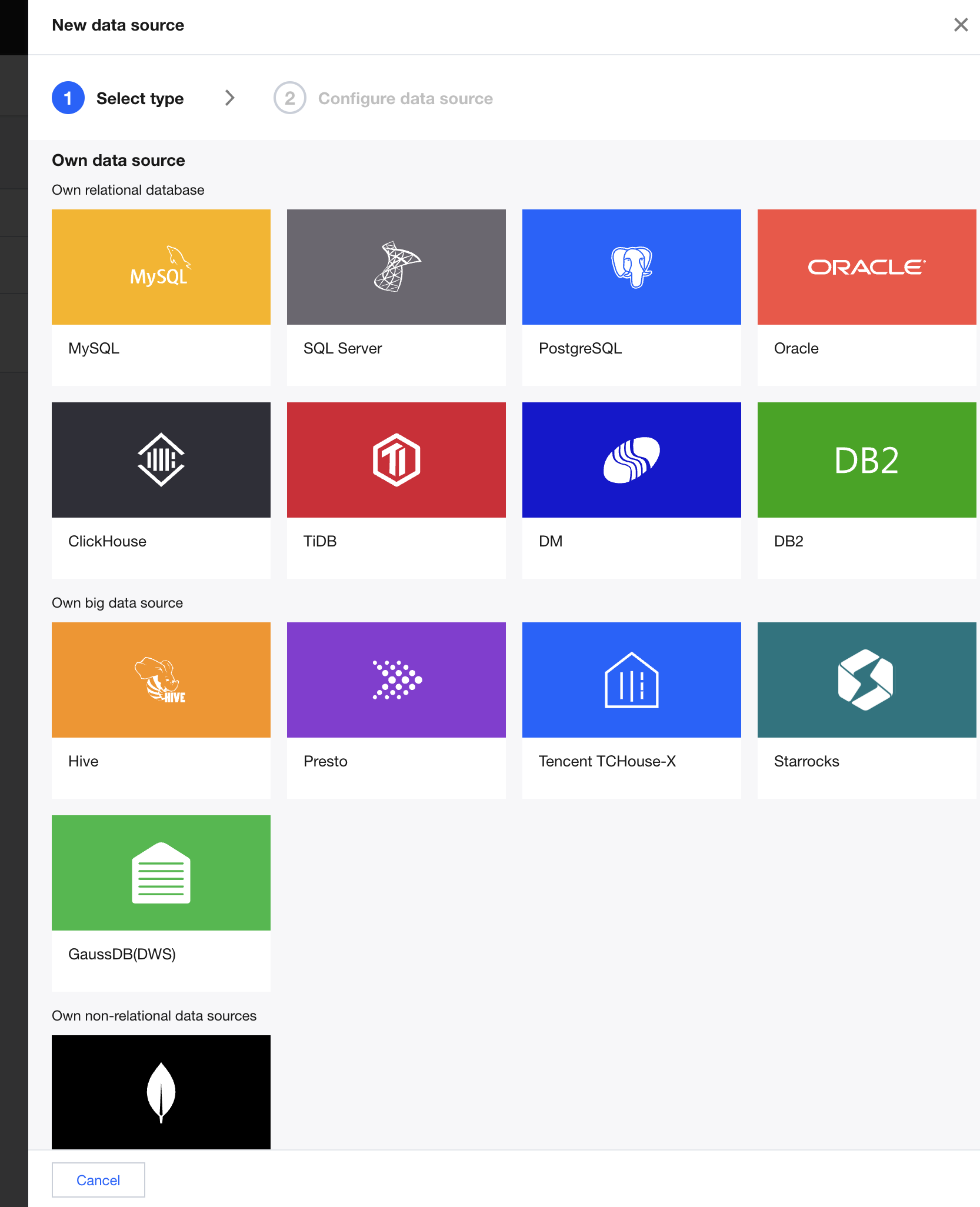 2. Click and select the self-built data source type to connect, either a self-owned data source or a self-owned big data source.