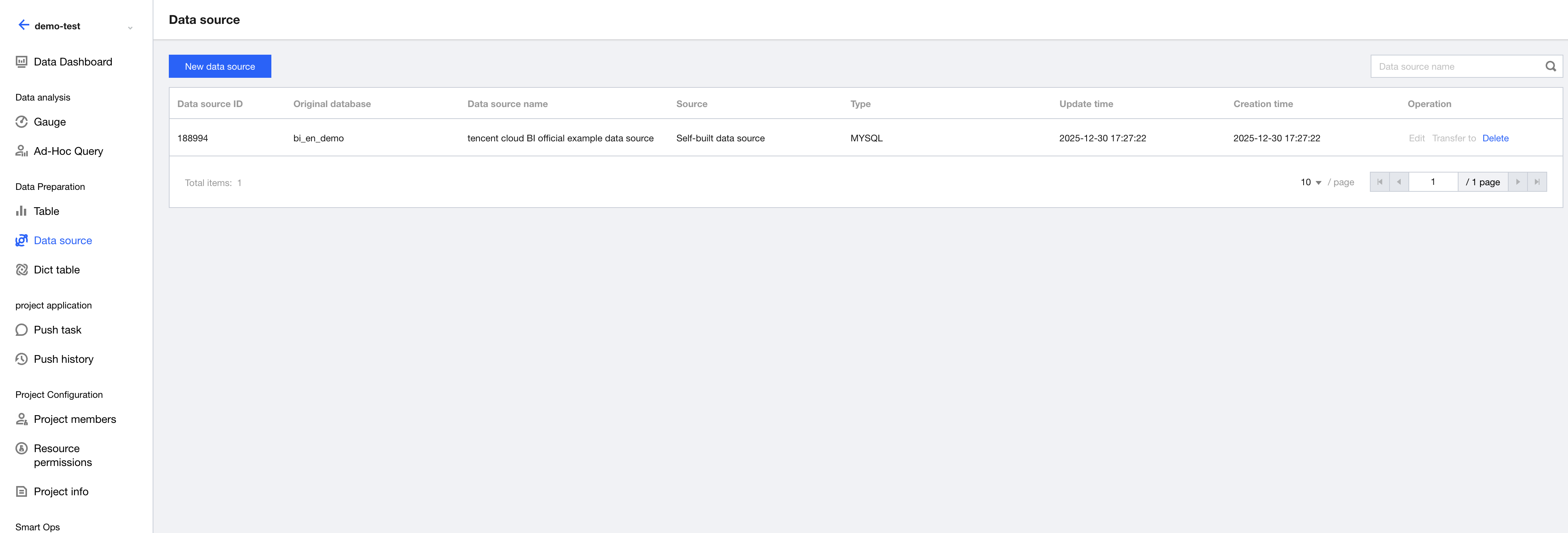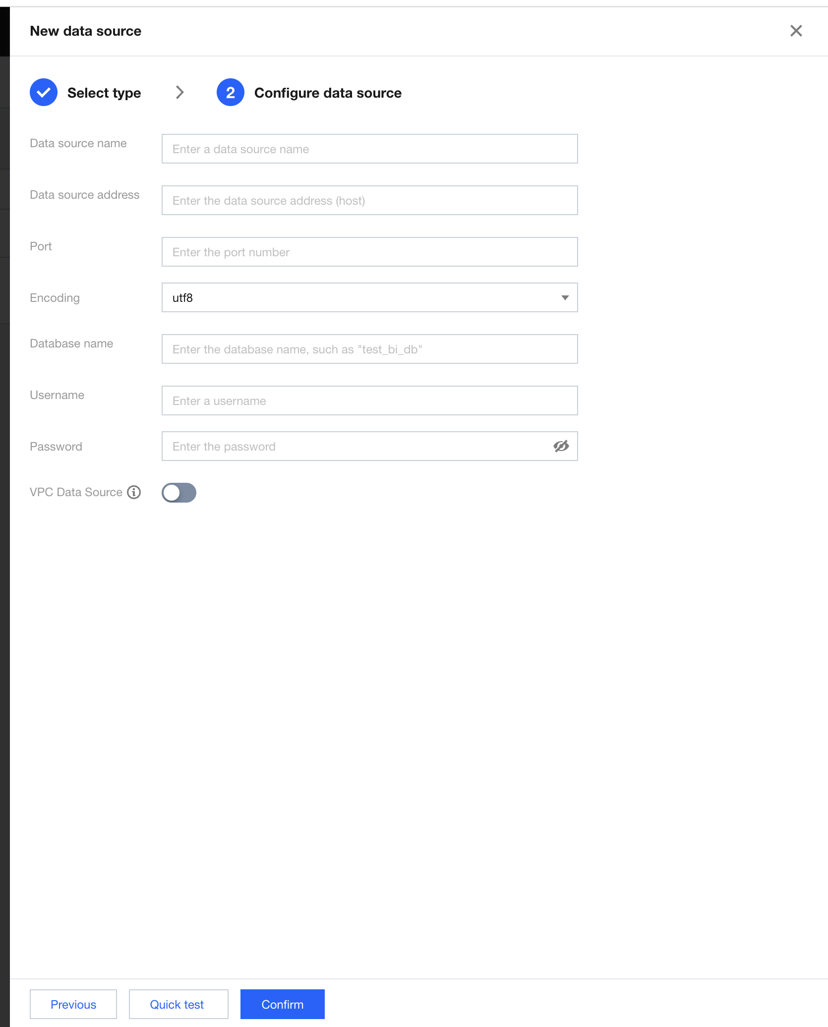 Data Source Address: IP address of the database, such as a public network address in the format of cdb-2dhmvx6s.bj.tencentcdb.com. Private network addresses in formats like 49.232.129.87 are not supported. If the database is purchased on Tencent Cloud and is a cloud database supported by BI, you can use the method described in Data Access - Creating Cloud Data Sources for connection. If it is a cloud database not supported by BI, you can enable the public network address and connect through your own data source.