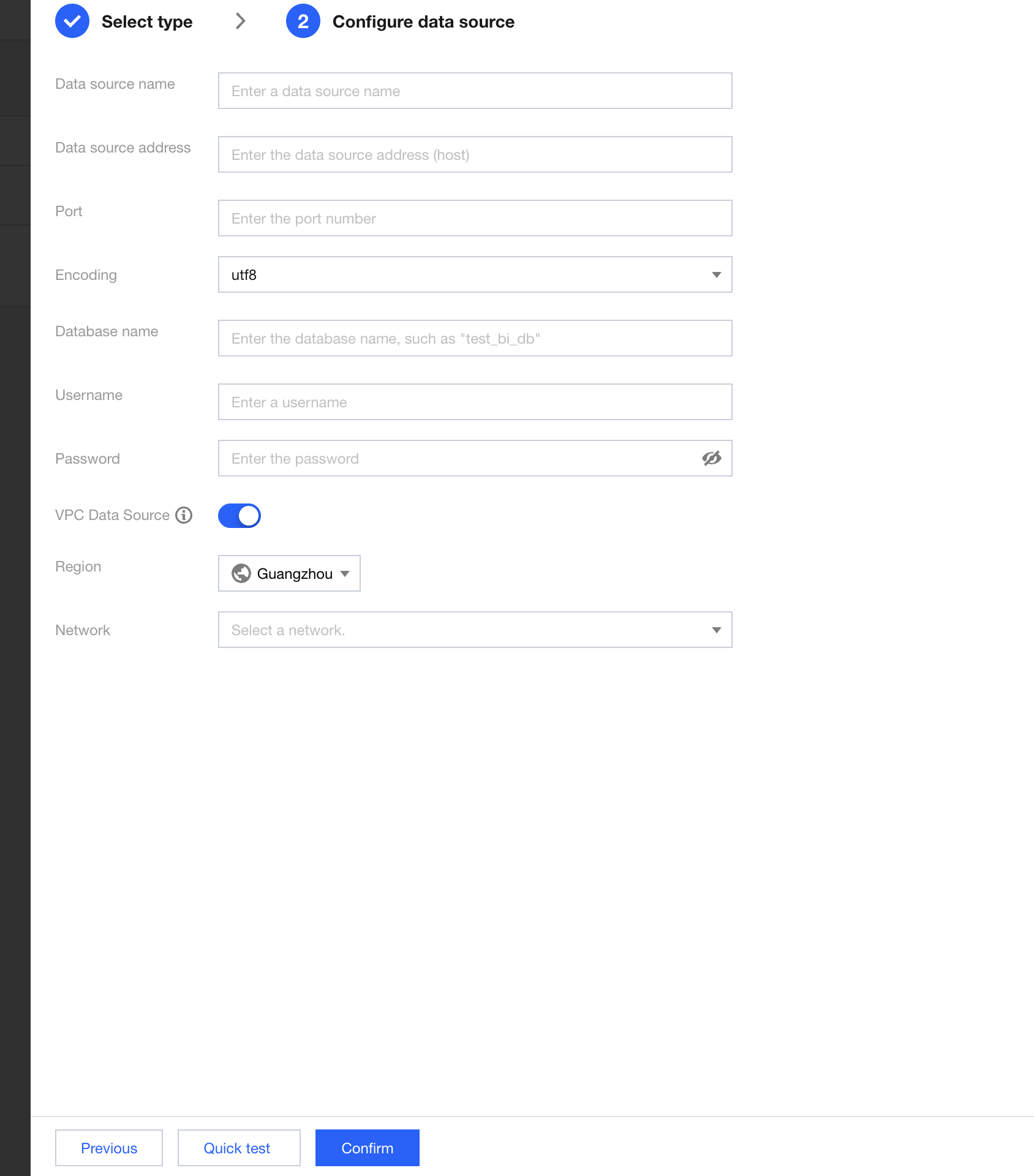 VPC Data Source: Enable VPC data source connection. When you turn on this switch, the data source address must be switched to the private IP address of the VPC network. After enabling VPC, you need to select the VPC network where the data source IP address resides.