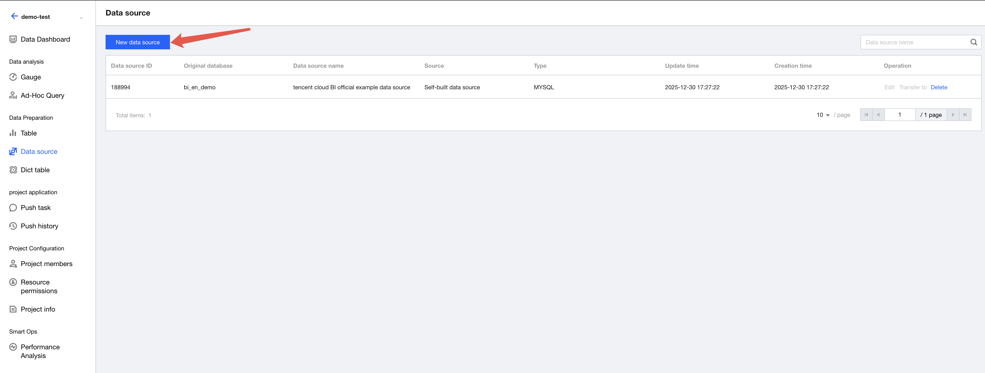 1. After creating a project, click Create Data Source under Data Source.