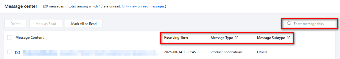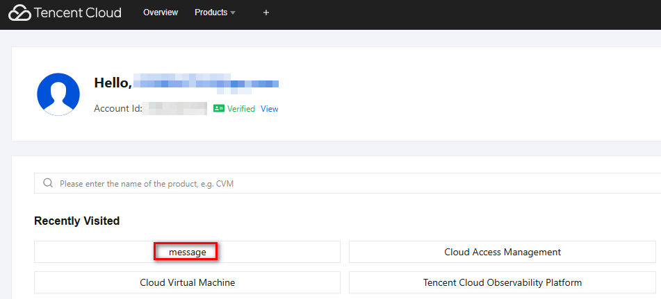 You can also directly search for "Message Center" or click "Recently Visited" to enter the Message Center on the console overview page. Viewing Message Center