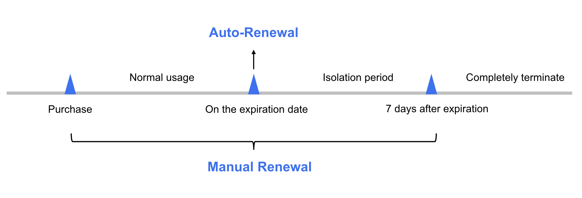 Auto-renewal: For monthly subscribed clusters with automatic renewal enabled, if the account balance is sufficient, renewal will automatically execute on the day of cluster expiration.