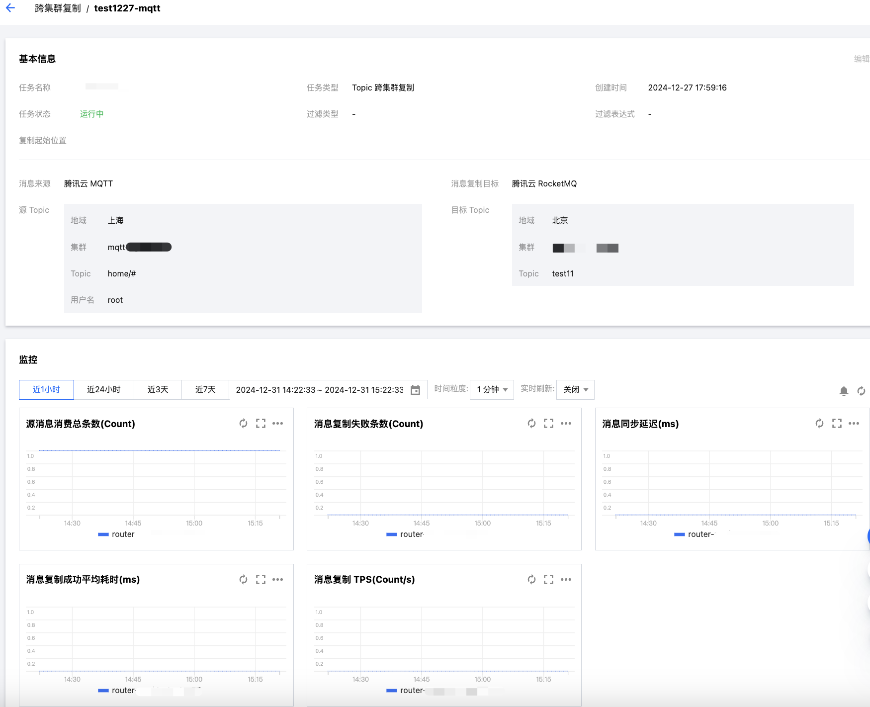 You can click the task name to go to the task details page to view the detailed configuration of the task, such as filtering rules and start time. In the monitoring section, you can view real-time monitoring data of the current message replication task, such as the total number of consumed messages in the source topic, the number of message replication failures, and the message synchronization delay.