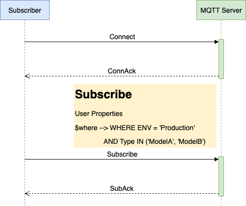 1. Each Subscribe request's User Properties can contain only one attribute with the Key $where. If multiple key-value pairs of $where→WHERE clause exist, only the first one takes effect.