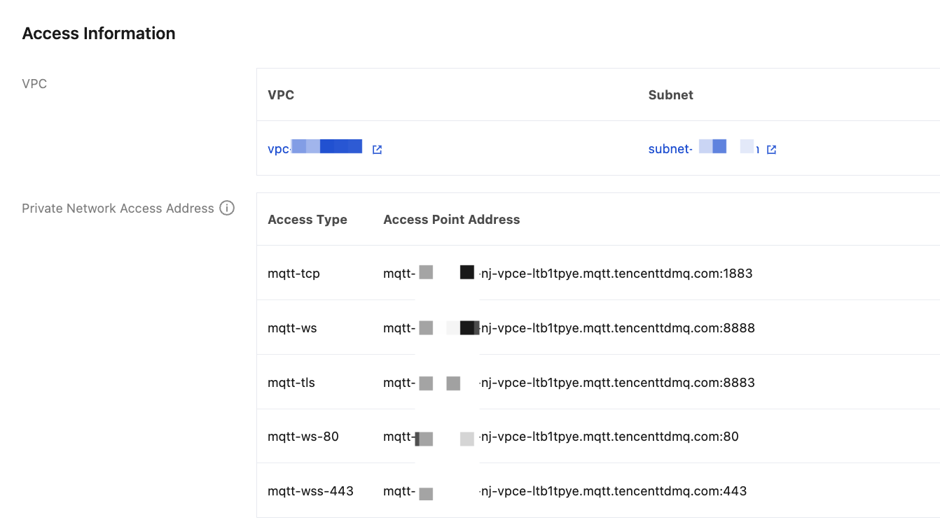 Standard WebSocket access point: ws://mqtt-xxx.mqtt.tencenttdmq.com:80/mqtt