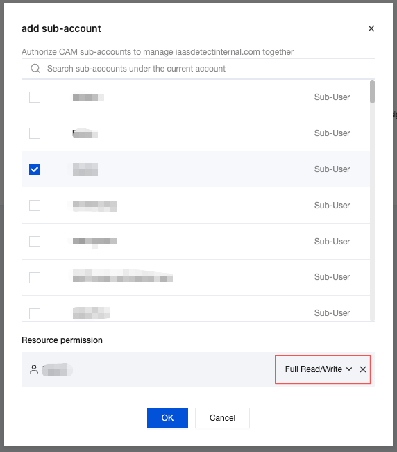 1. Enter the account ID or username of the sub-user or collaborator for sharing in the search box of the Add a Sub-account window and check the account, and set the resource permission as Full Read/Write, as shown below: