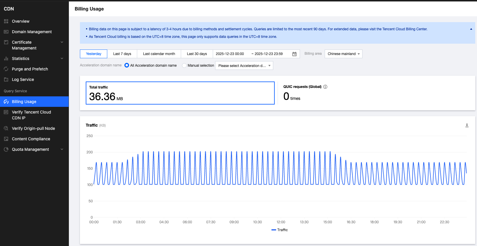 Billing usage provides query capabilities for usage data from a billing perspective for the past 90 days, allowing you to query data such as traffic, bandwidth, as well as HTTPS and QUIC request counts from a billing dimension.