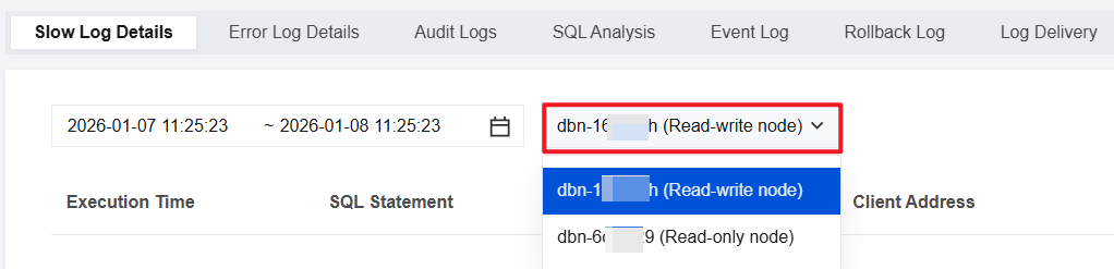 For cluster edition instances, you can select a specific node of an instance to query both slow log details and error log details on the operation log page.