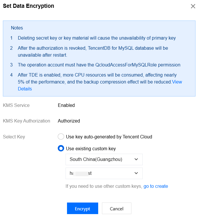For users who have newly purchased the Key Management System (Prepaid Edition), when their account is in arrears, the Key Management System, having been prepaid for a certain period, will not affect the retrieval of KMS keys, nor will it impact tasks such as migration and upgrading during this period. Please be mindful of the renewal time for your KMS keys. Failure to renew them upon expiration will also affect the use of Transparent Data Encryption features. To manage your KMS keys, please visit the Key Management System Console. TencentDB for MySQL instances and Key Management Service (KMS) support different regions. When a key is created, if there is no corresponding region in China in KMS, you can choose to create it in the Guangzhou region; if there is no corresponding region outside China, you can choose to create it in the Hong Kong (China) region.