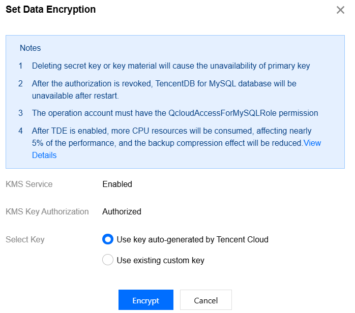 TencentDB for MySQL does not provide the keys and certificates required for encryption. The keys used for transparent data encryption are generated and managed by the KMS. The relevant explanations regarding the keys are as follows. The TDE feature incurs no additional charges; however, the Key Management System will generate extra costs. Please refer to the Billing Overview for more details. The Key Management System (Postpaid Version) will cease operations on December 30, 2024. From this date forward, the Key Management System will no longer support the pay-as-you-go billing model, exclusively supporting a prepaid billing approach.