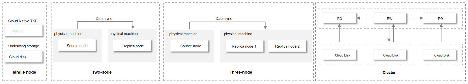 TencentDB for MySQL supports four instance architectures: single-node, two-node, three-node, and Cluster Edition.