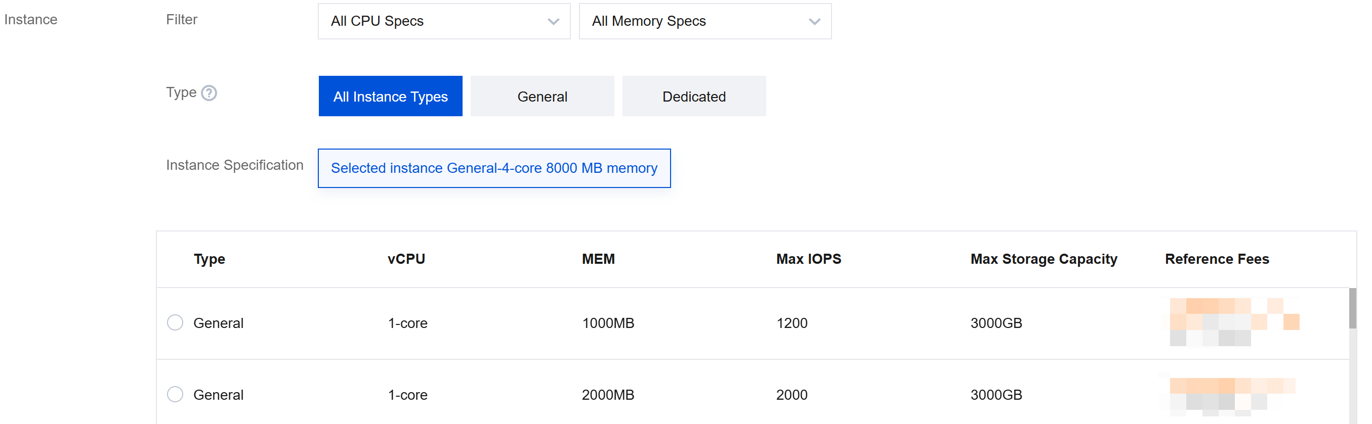 General Type | An instance exclusively utilizes allocated memory and disk resources while sharing CPU resources with other general instances on the same physical machine. * Benefit from resource sharing, bringing higher cost-effectiveness and minor CPU resource reutilization. The disk capacity is not tied to the CPU and memory, allowing for flexible matching. |