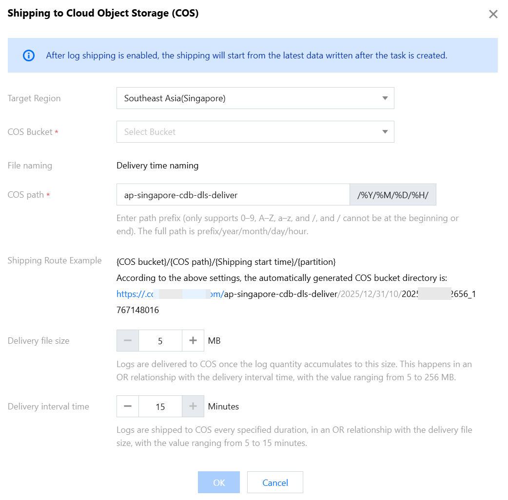 7. In the Shipping to Cloud Object Storage (COS) pop-up window, complete the following configurations, and click OK.