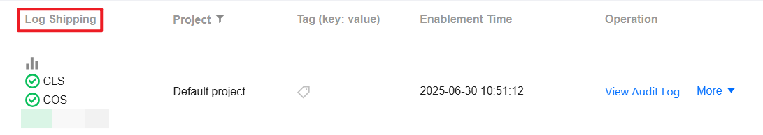 After database audit log shipping to COS is enabled for an instance, you can view the current information on log shipping to COS (such as the COS bucket, region, and creation time for log shipping).
