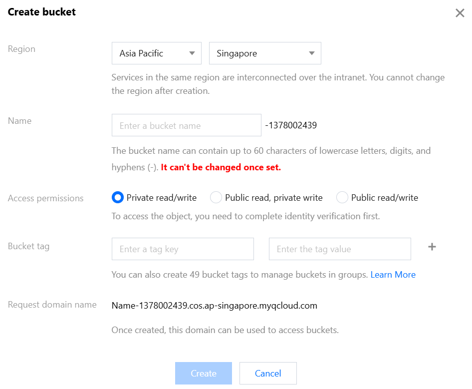COS Bucket | Select an existing COS bucket. The dropdown list supports quick search. If no COS bucket exists, you can select Create Bucket in the dropdown list. If you have not activated COS, the system guides you to activate it during the bucket creation process before you can proceed to complete the bucket creation operation. |