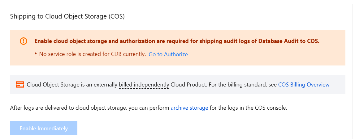 6. In the pop-up sidebar, click Enable Immediately below Shipping to Cloud Object Storage (COS).