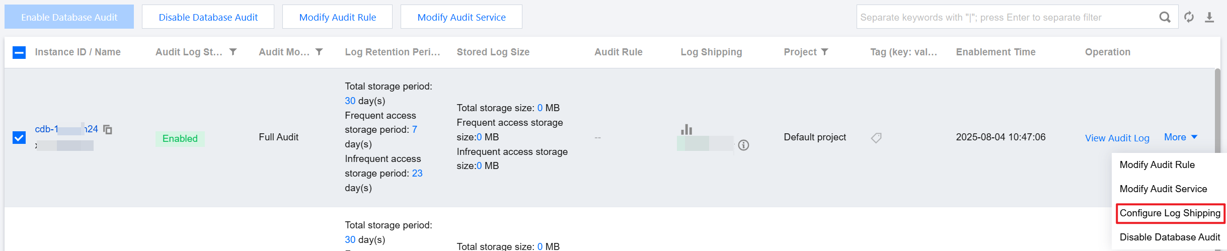 4. Find the target instance in the audit instance list (or search for the instance by resource attributes in the search box), and choose More > Configure Log Shipping in the Operation column.