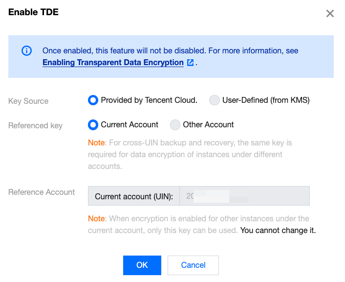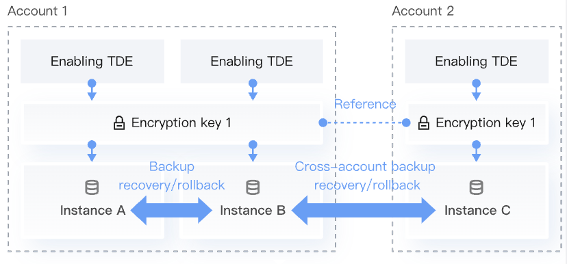 If a user has multiple primary accounts (UINs) and all require the TDE feature, and cross-account backup, recovery, migration, or rollback operations are needed between these accounts, ensure that all primary accounts reference the same key. For example, after enabling TDE for instances in Account 1, when enabling TDE for instances in Accounts 2, 3, and 4, the key source needs to select "provided by Tencent Cloud" and the encryption key from Account 1 needs to be referenced. Otherwise, cross-account operations (including but not limited to cross-account rollback, backup, recovery, and migration) will not be possible.