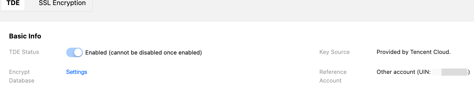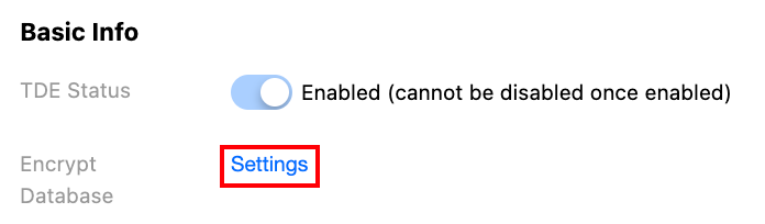5. After you successfully enable TDE, the TDE encryption status will display Enabled (cannot be disabled once enabled).