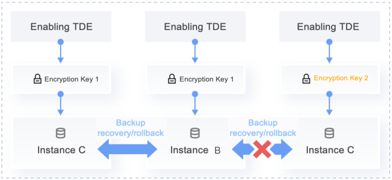 | Cross-region rollback | For instances with cross-region backup enabled, cross-region backup files are encrypted. When using encrypted cross-region backups for rollback in a different region, the keys for instances in different regions under the same account need to be initialized consistently to support cross-region rollback. Rollback is allowed if the keys on the source and target instances are consistent, or if the source database has encryption disabled, or if the target instance has encryption enabled with consistent keys. |