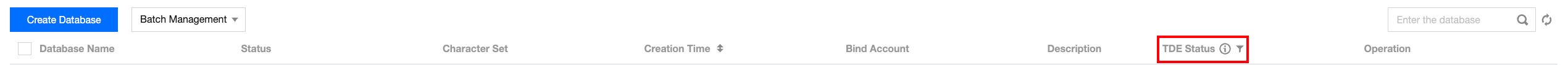 5. After enabling TDE at the database level for specific databases, you can view the encryption status of databases under database management by using the TDE Status field.