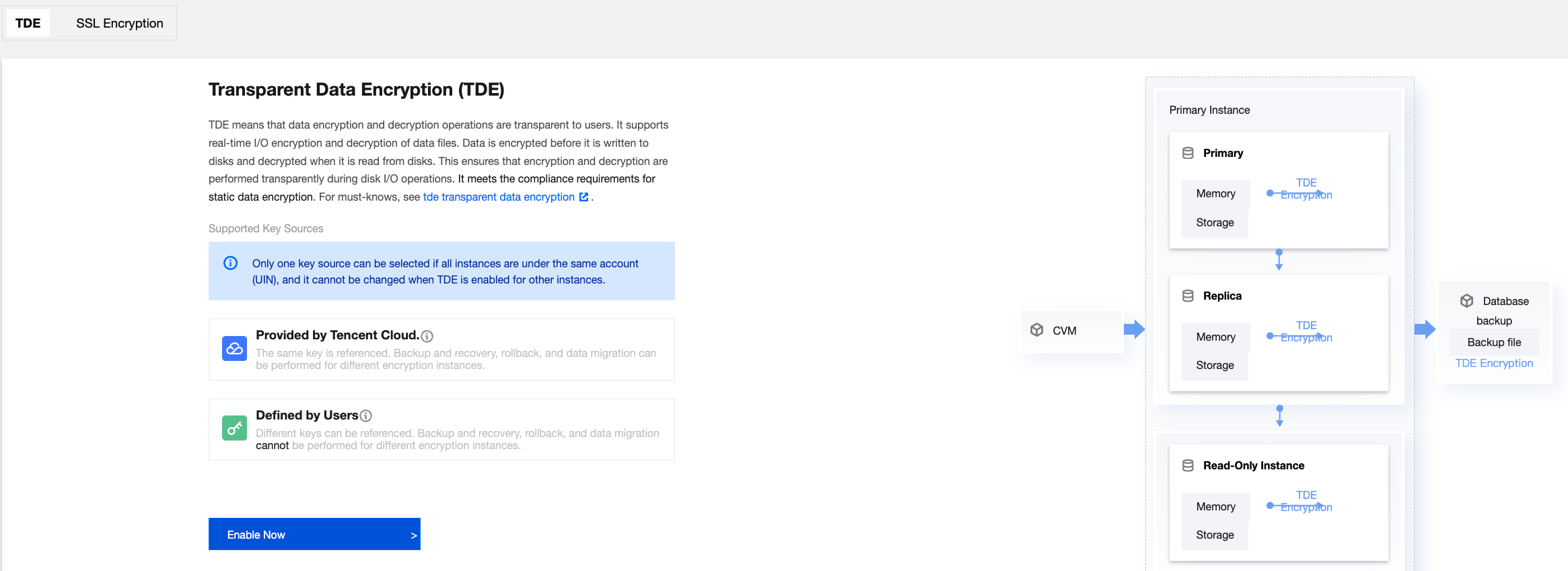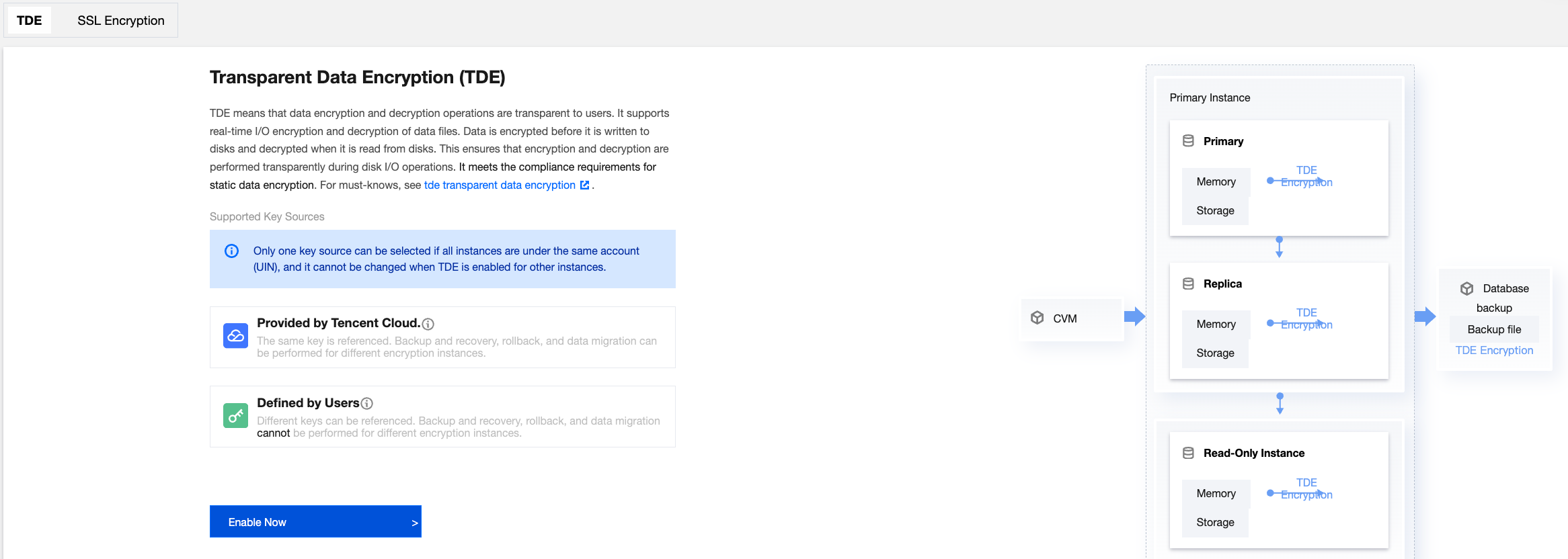 4. Since instances under the current account have already enabled TDE with the key source as "provided by Tencent Cloud," the key source will default to this option. You can directly click Enable Now.