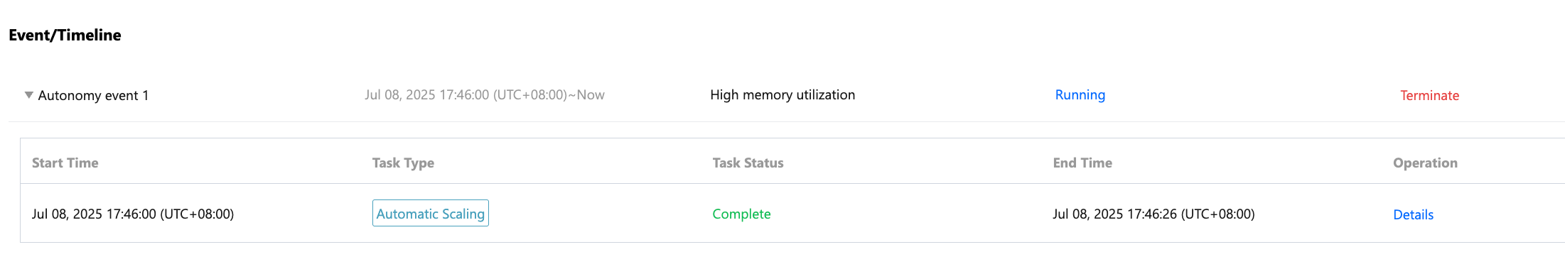View autonomy event details: Click Details in the operation column to view the task details, timeline, and task history backtracking information.