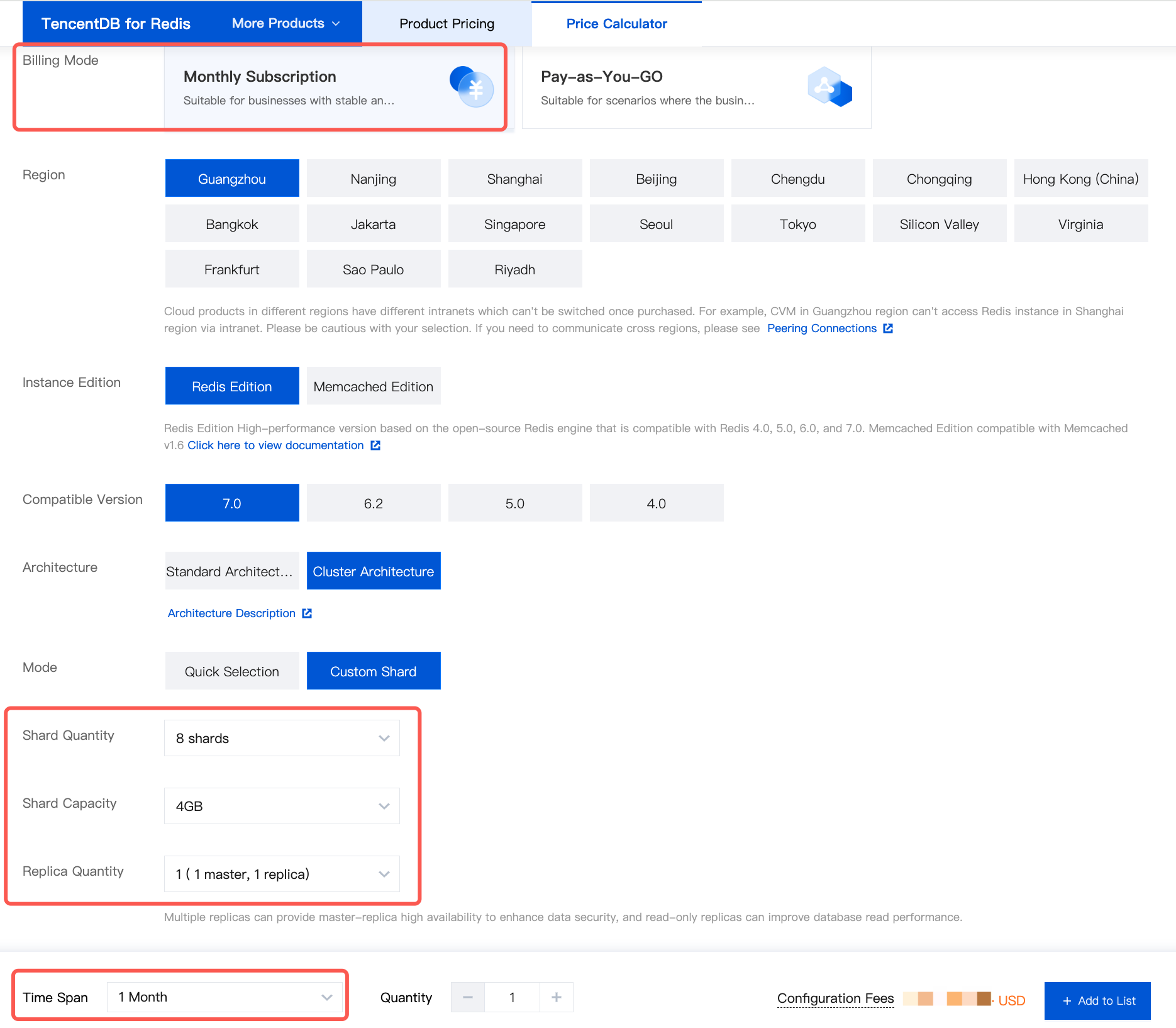 Log in to Pricing Center. Select the Yearly/Monthly Subscription billing mode, and configure instance specifications and purchase duration. The corresponding product pricing is displayed in real time in the lower-right corner of the page, as shown in the figure below. Pay-as-You-Go