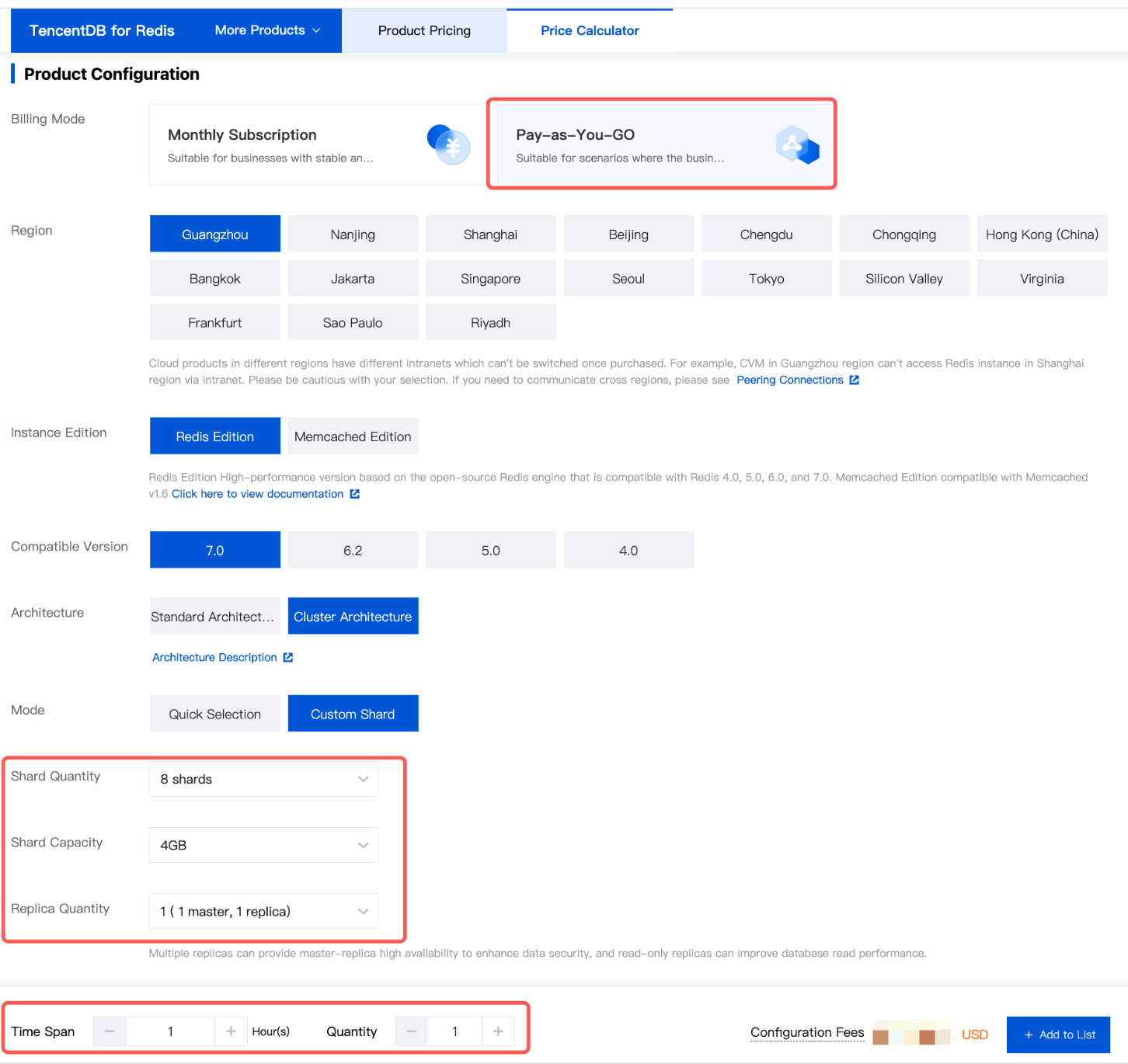 Log in to Pricing Center. Select the Pay-as-You-Go billing mode, and configure instance specifications and purchase duration. The corresponding product pricing is displayed in real time in the lower-right corner of the page, as shown in the figure below.