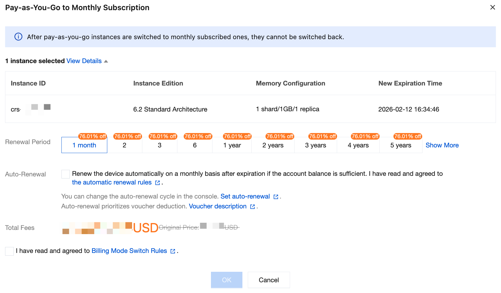 6. Confirm the Total Fees, read the billing mode switch rules, select I have read and agreed to, and click OK.