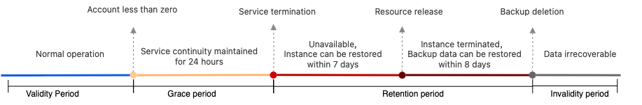 Invalidity period | 15 days after shutdown | All backup data of TencentDB for MongoDB resources is completely terminated and cannot be restored. Note: Tencent Cloud will send a notification when resources are terminated, which contains the overdue payment amount and all products with resources terminated under the account. |
