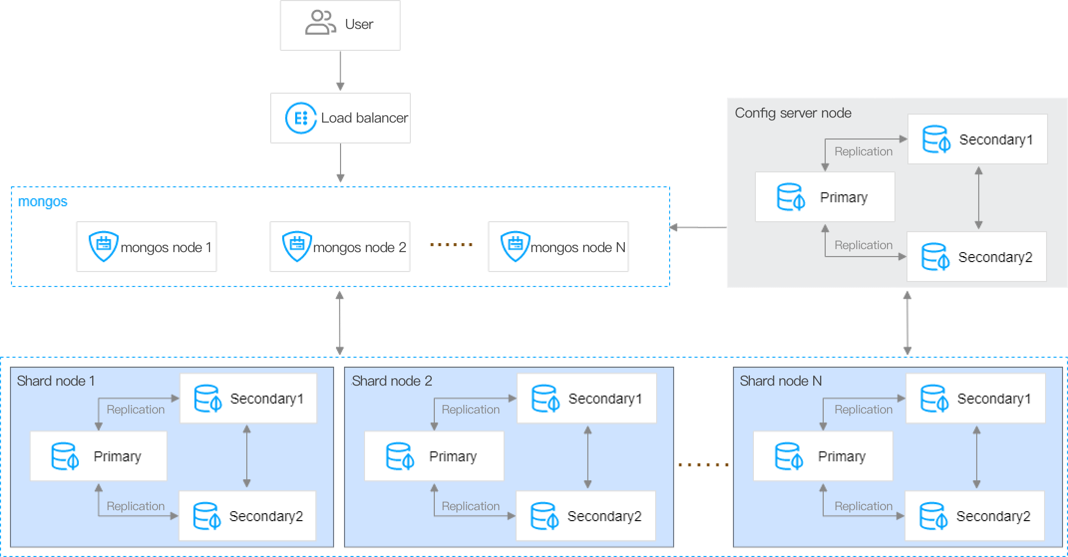 mongos node | Handles request routing and load balancing by routing requests to the corresponding shards within the cluster and assembling the received responses to return them to the client. | 3–32 nodes are supported, enabling load balancing and failover. |