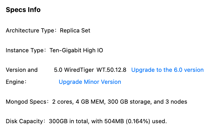 Major version upgrade: refers to a major version change (such as 4.0 → 4.2), which typically introducing new features, performance optimization, and other significant improvements. For the features supported by each version, see Major Version Feature Details. Minor version upgrade: typically refers to a patch version update of the storage engine (such as WT.40.3.34 → WT.40.3.35), which primarily includs bug fixes, security patches, and minor performance improvements. For minor version update records, see Minor Versions and Storage Engine. Upgrade Mechanism