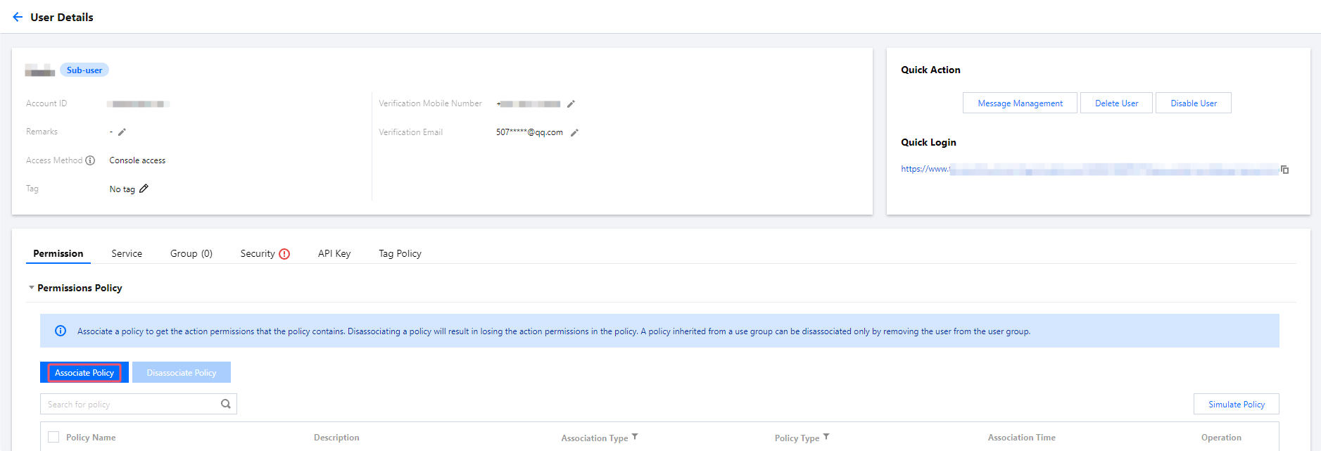 You can associate policies on the user/user group management page or policy management page. For detailed directions, see Authorization Management. Method 1. Add a policy to a sub-user or user group