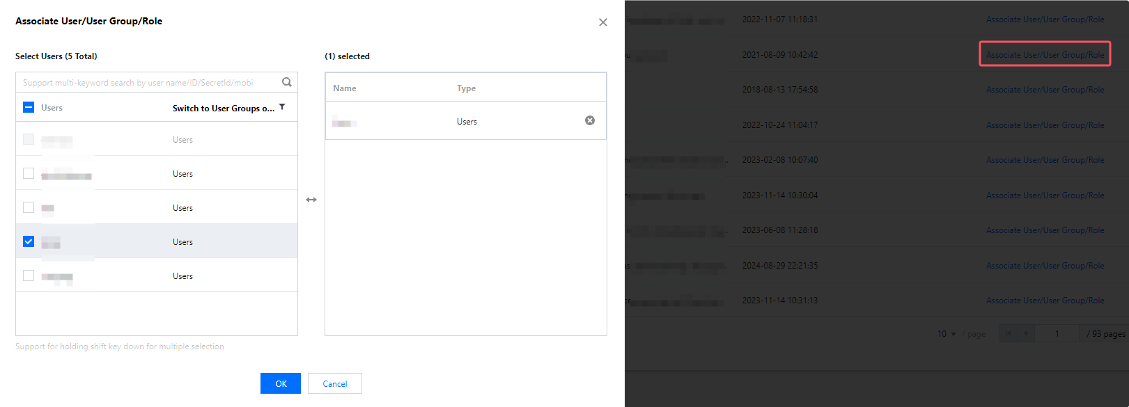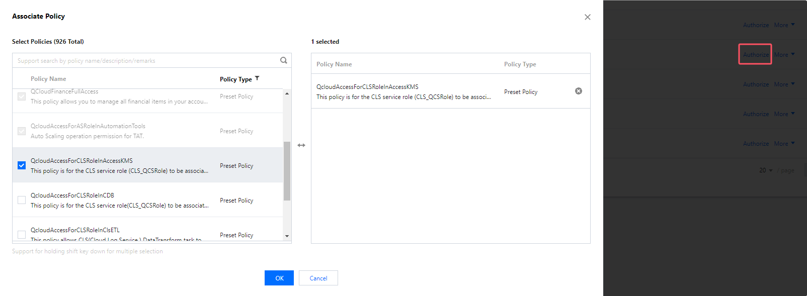 Select Policies on the left sidebar of the CAM console, find the policy you want to associate, and click Associate User/User Group/Role in the Operation column. Select the user/user group you want to associate the policy with, and click OK.