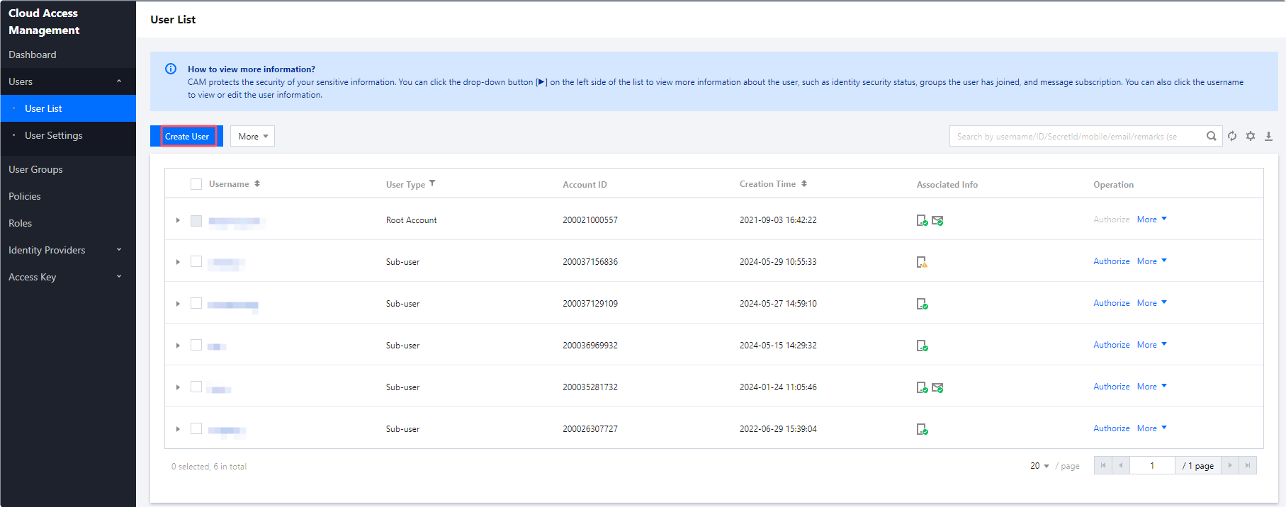 One or more sub-users can be created under each root account and can be associated with specific roles and policies. A sub-user has a unique ID and identity credential that can be used to log in to the Tencent Cloud console. It also has API access. You can log in to the CAM console to create a sub-user. Step 2. Add a policy to the sub-user or user group