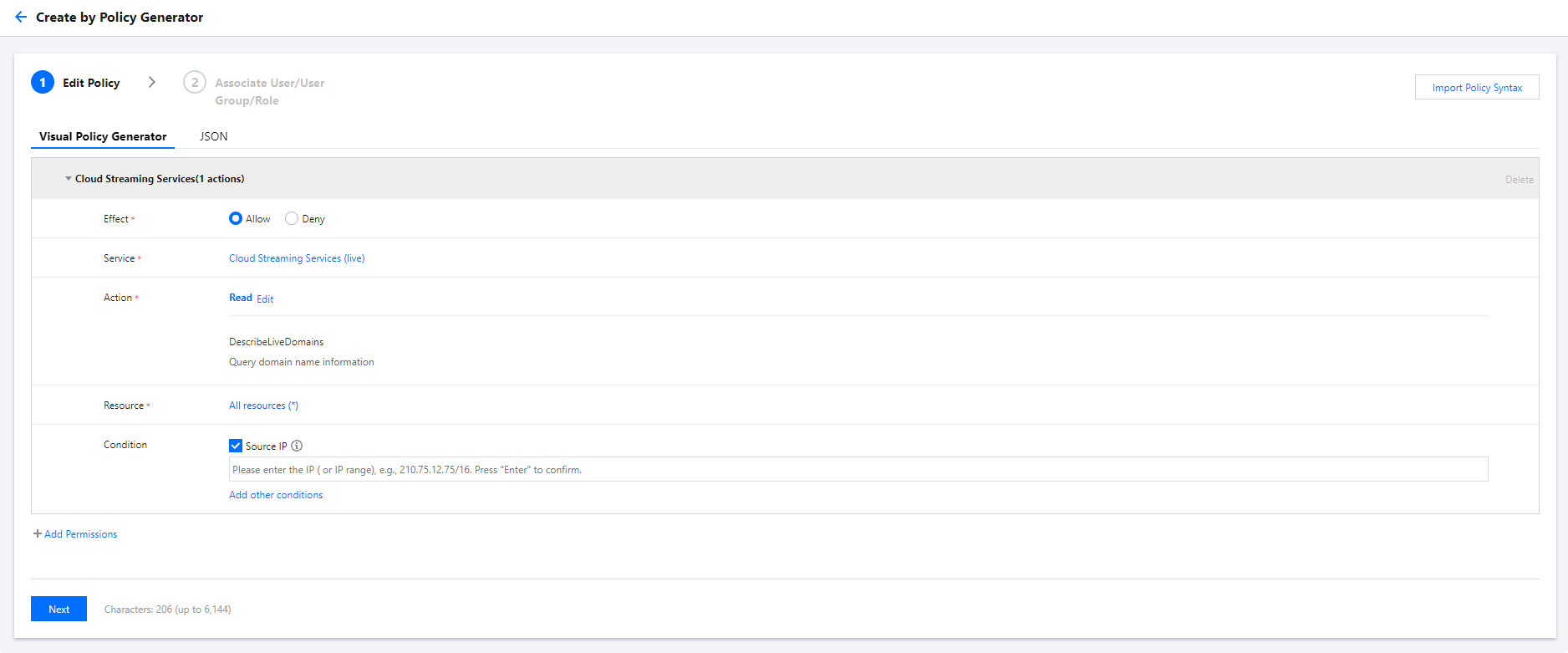 Example: If you want to allow a sub-user to use the DescribeLiveDomains API, follow the steps below to grant the permission.
