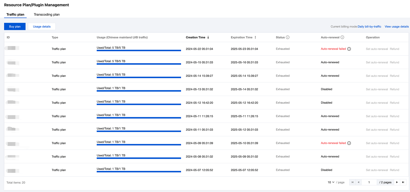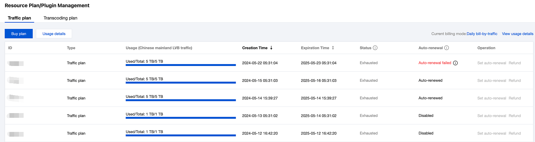 1. For the same type of resources, automatic renewal can be set for only one package. For example, if a 500 GB live streaming traffic package with automatic renewal enabled and a 100 GB live streaming traffic package are purchased at the same time, setting automatic renewal for the 100 GB traffic package will disable renewal for the 500 GB traffic package.