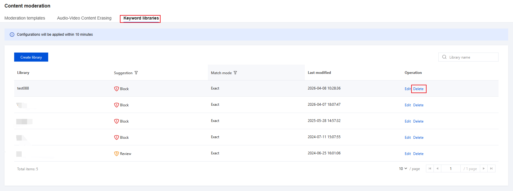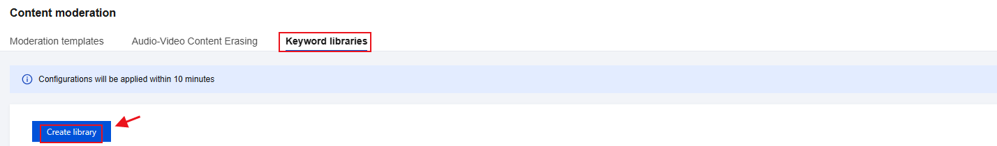 1. Log in to the CSS console and navigate to Feature Configuration > Content moderation > Keyword libraries.