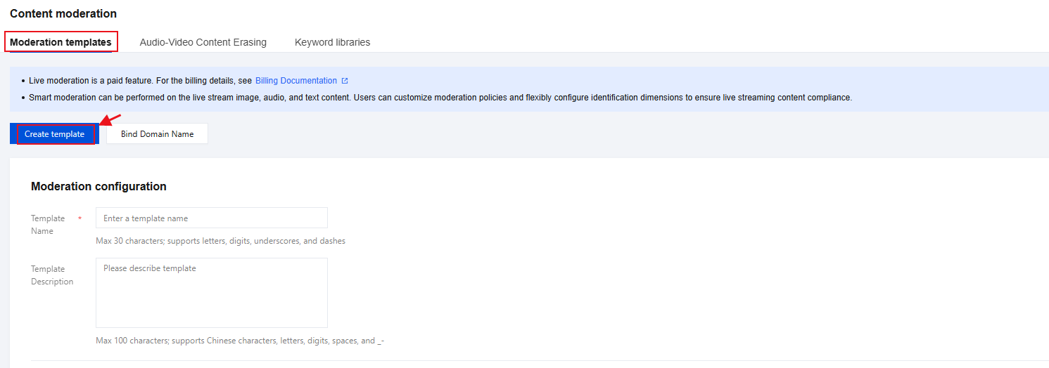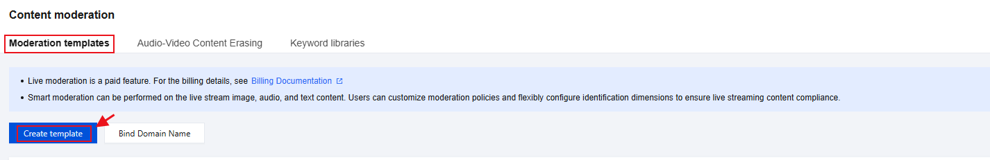 Bind a domain after creating a new moderation template: After successfully creating a moderation template, click Bind Domain Name in the pop-up window.
