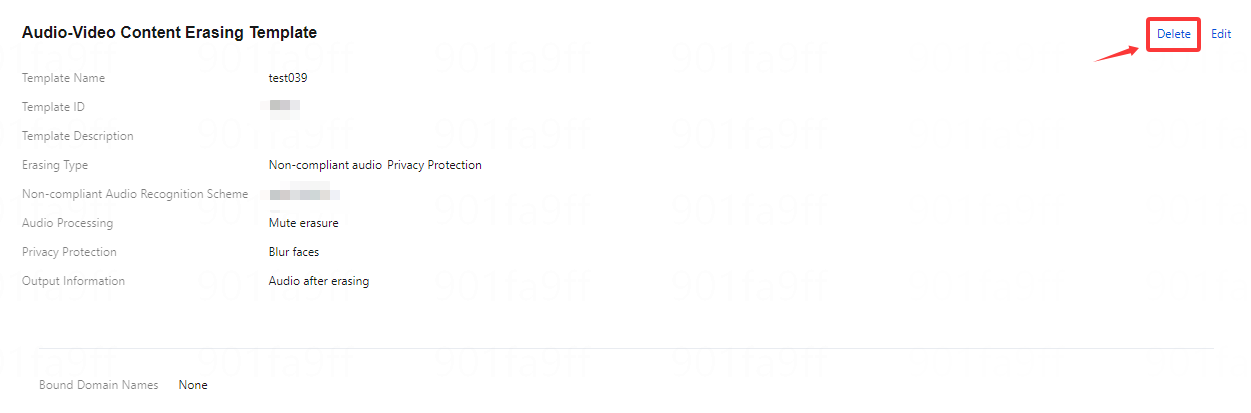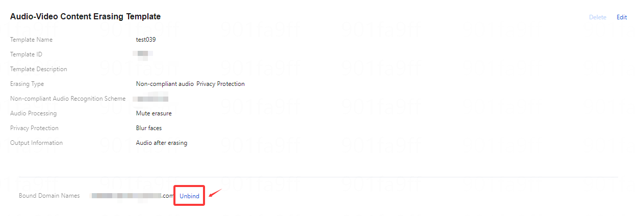 1. Log in to the CSS console. Choose AI Features > Audio-Video Content Erasing . 2. Select the Audio-video content erasing template from which you want to unbind the push domain and click Unbind.