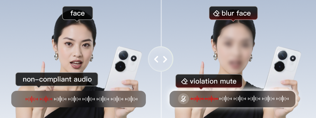 Audio-video content erasing—Live stream moderation 2.0 can precisely identify non-compliant audio content and privacy-related images, such as faces and license plates, during live streaming and then automatically execute real-time erasing. This achieves full-process automated content risk control and management and guarantees content security and compliance of live streaming platforms.