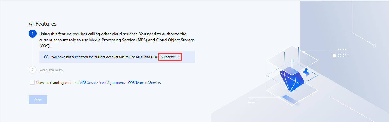 4. After successful authorization, select the service agreement and click Start. The system will automatically activate the Media Processing Service product and Cloud Object Storage (COS), and will redirect you to the Intelligent Summary management page.