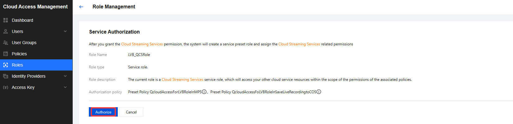 3. On the role management page, click Authorize. After completing identity verification, you can authorize Media Processing Service and Cloud Object Storage (COS) and use the Media Processing Service and Cloud Object Storage services normally.