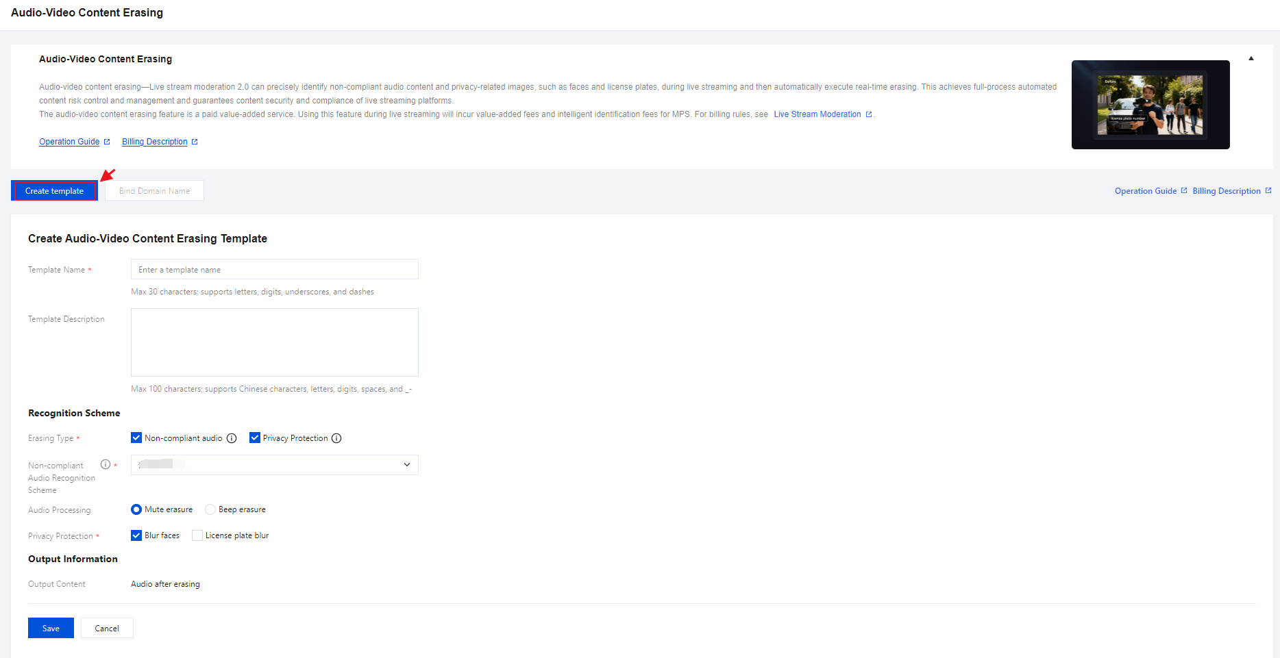 Recognition Scheme | Erasing Type | Erasing Type supports Non-compliant audio and Privacy Protection, which can be selected individually or in combination. Non-compliant audio, Recognize non-compliant text content in the live streaming audio and mute the corresponding audio segments to effectively guarantee live streaming content security. Non-compliant Audio Recognition Scheme:Bind a template in the live stream moderation module with Audio text recognition selected for Moderation Content Configuration. Audio Processing: A single-select option supporting either "Mute erasure" or "Beep erasure," with "Mute erasure" being the default selection. Privacy Protection:Recognizes faces, license plates, and flags in live streams and blurs them to ensure live content privacy. Privacy Protection: Required field. You can select either Blur faces or License plate blur by choosing one or multiple options. |