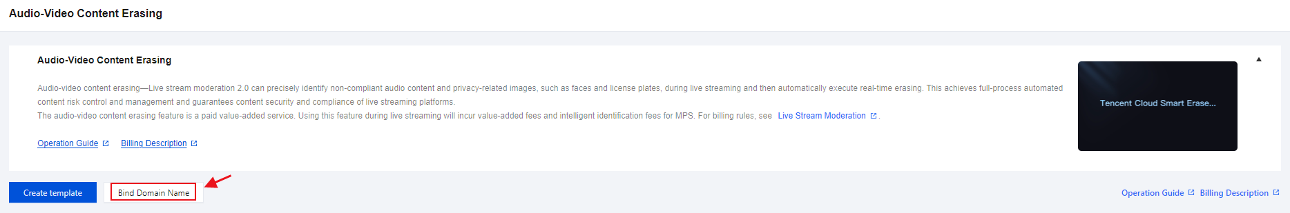 1. Log in to the CSS console. Choose AI Features > Audio-Video Content Erasing . 2. You can bind the moderation template to a push domain with the following methods: