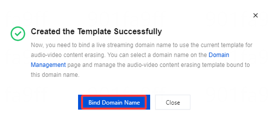 Bind a domain after creating a new Audio-video content erasing template: After successfully creating a Audio-video content erasin template, click Bind Domain Name in the pop-up window.