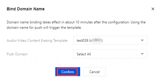 3. In the Bind Domain Name window, select the Audio-video content erasing template and push domain name(Multiple push domain names can be bound simultaneously) you want to bind together, and click Confirm to bind them.