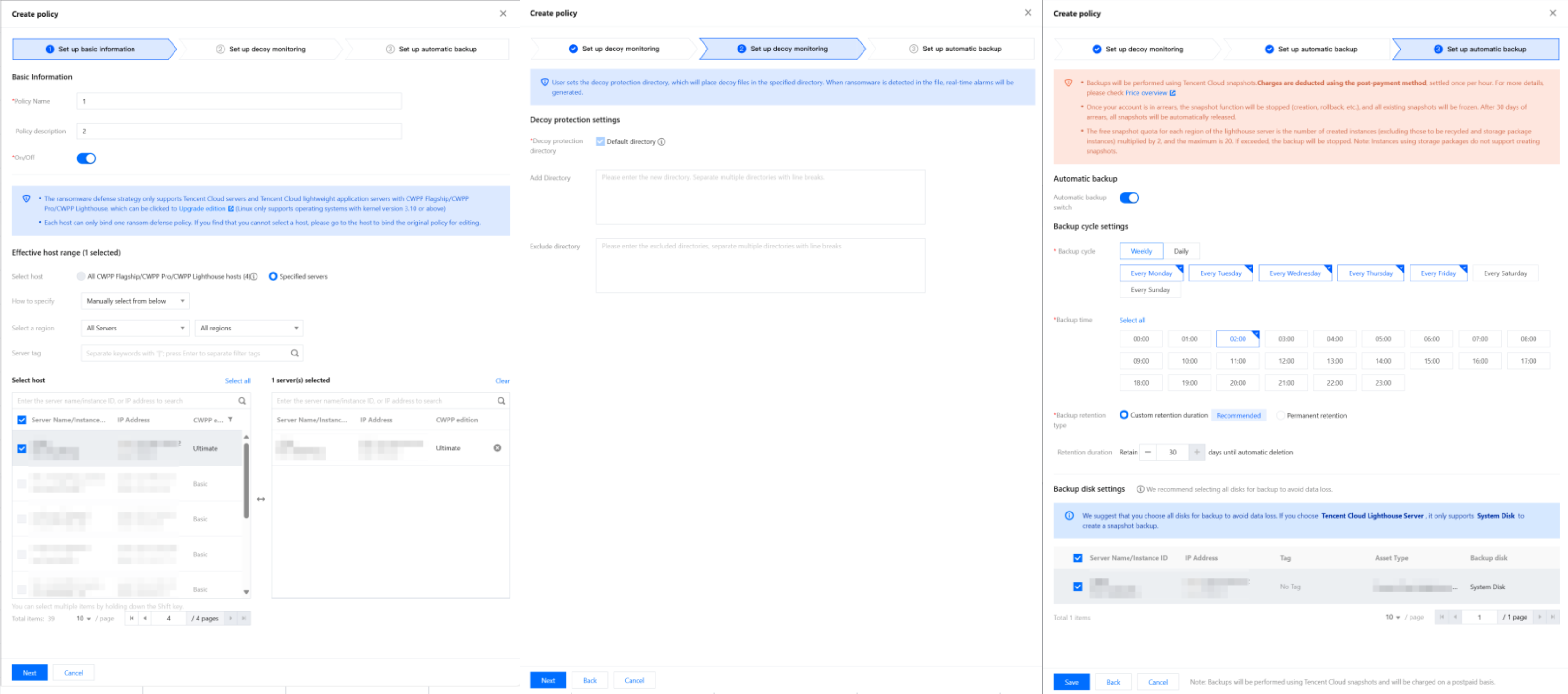 1. 1. Log in to CWPP Console, select Advanced Defense > Ransomware Defense in the left sidebar. 2. In Ransomware Defense > Policy Details, click Create Policy, and follow the three steps below to create a defense policy.