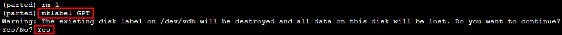 In this example, there is only one partition, so you can enter rm 1 and press Enter to delete partition 1.p and press Enter to view the current partition information. Check whether the last partition has been deleted.mklabel GPT and press Enter to create a partition in GPT format.Yes and press Enter.